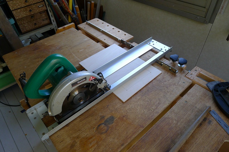 乾く間に、クランプジグをつくる。愛用の丸鋸ガイドが活躍。5mm厚のシナベニアなのでカッターナイフで仕上げる。
