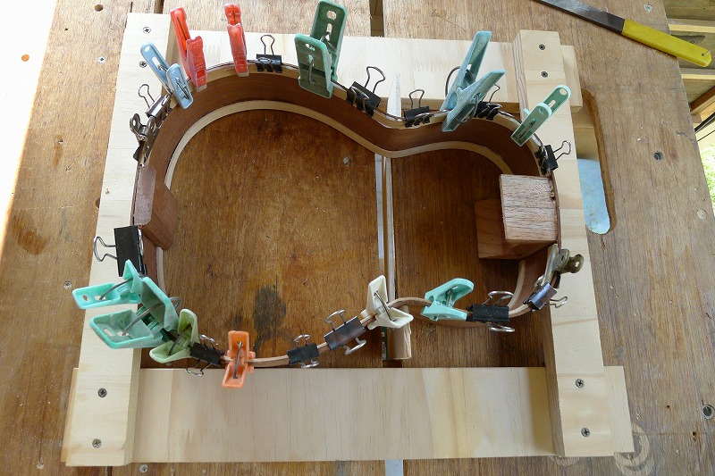 次に表板、裏板を接着するための桟を接着する。楽器の組立っぽい仕事である。外回りをフレーム、くびれをクランプジグできめている。