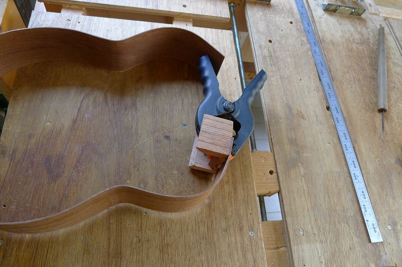 朝9時。まず、ネックブロックとテールブロックを側板に木工ボンドで接着する。