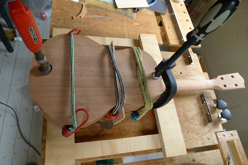 小屋でフレットの端をヤスリで仕上げ大量発汗。いよいよネックを取りつける。ダボ補強してある。