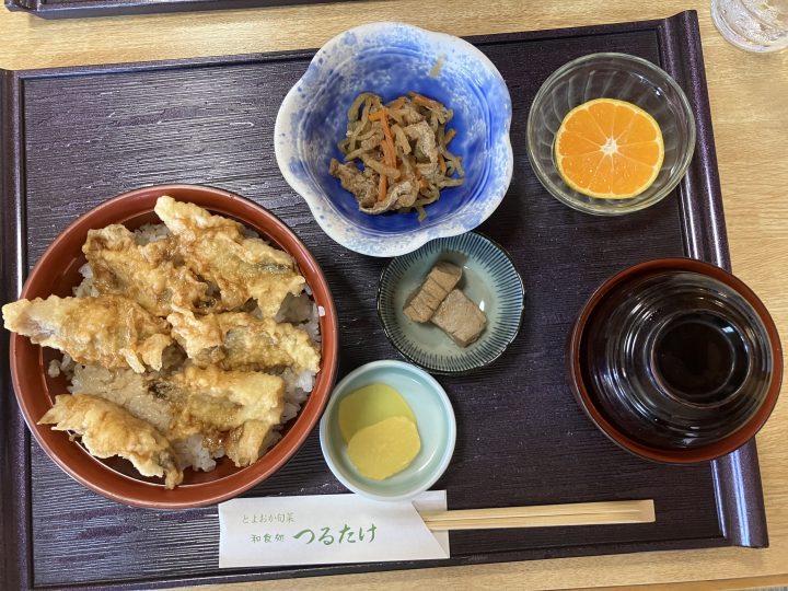 浜松への戻り道、豊岡の「つるたけ」さんでイワシ天丼を食べました。