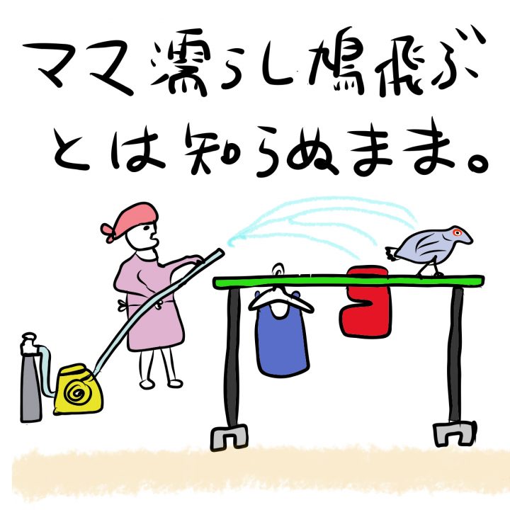 鳩を追い払おうとして、洗濯物を濡らしました。鳩は飛んでよけました。