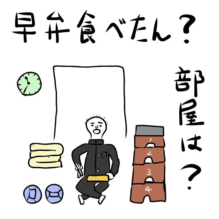授業中の早弁は臭いでバレるので、体育館器具庫にしました。