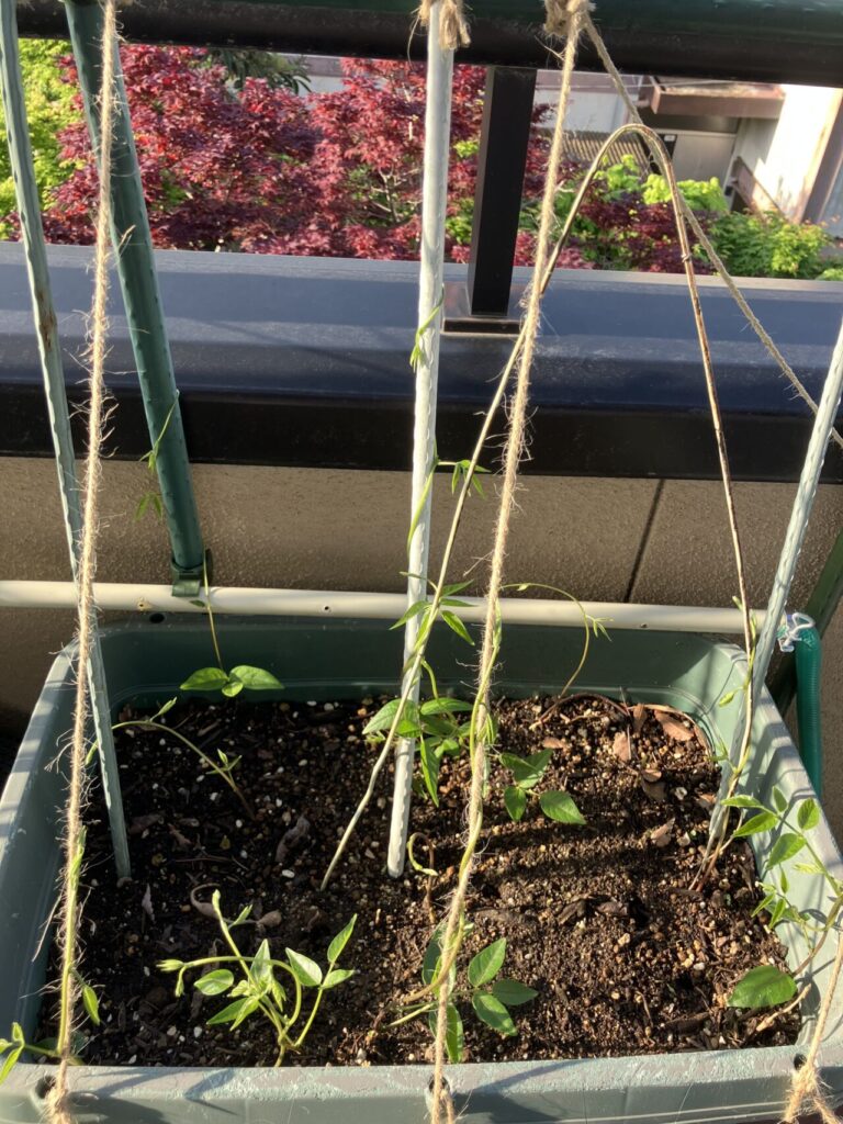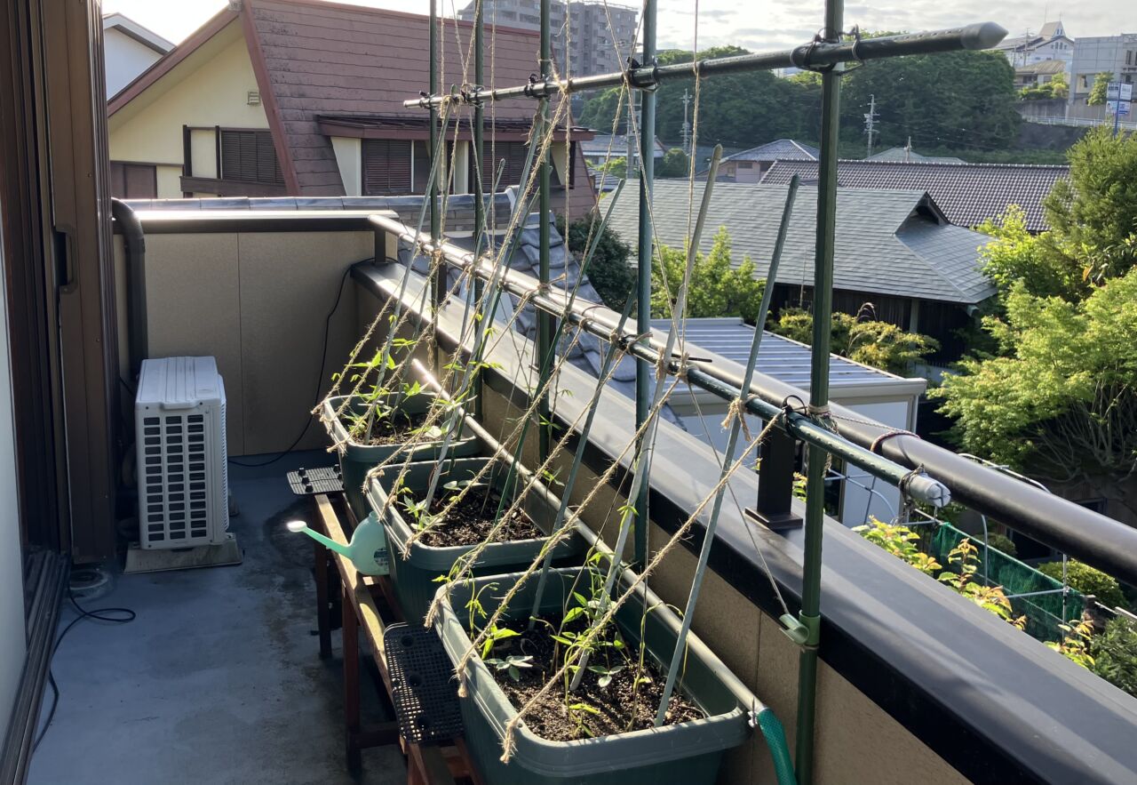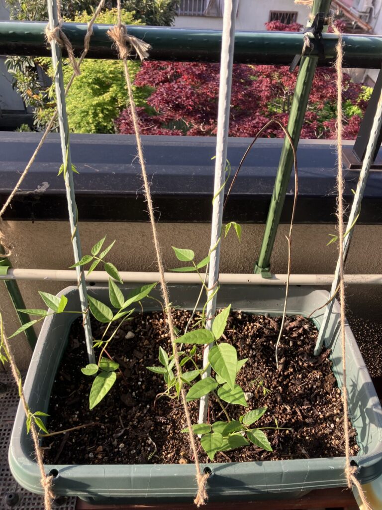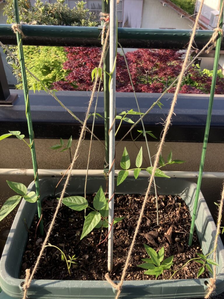 グリーンカーテン作戦 2 夏に備えて2階ベランダにグリーンカーテンを育てます。発芽から一週間、すごい勢いです。 一番長いものは50cmくらいです。 誘引の支柱、ヒモを追加しました。 7月頃には、小さな葉でビッシリになると思います。秋には美味しい芋を食べられると思います。